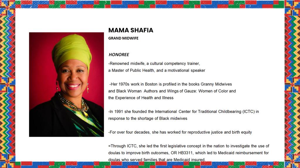 With the support of Ayanna Ade and other educators, Mama Shafia Monroe, after witnessing a deep void and lack in birthworkers of color in Portland, Oregon where she had moved her family in 1990, founded the International Center for Traditional Childbearing (ICTC) in 1991 to fill the gap. The years of ICTC were a fervor of rich gatherings among birthworkers of color across the country, seeding, watering and nourishing connections, and collective visions. Birthworkers that attended ICTC recall the incredible sense of community and support they felt in their work. With Mama Shafia’s leadership, ICTC’s mission was to increase the number of midwives, doulas, and healers in order to reduce infant and maternal mortality, increase breastfeeding rates, and empower families. “Its vision was that there be a midwife for every community, a healthy baby born to every family and the midwife as the norm for women of color.”* In 2016, Mama Shafia retired and in the following years, ICTC transitioned into the National Association to Advance Black Birth.